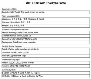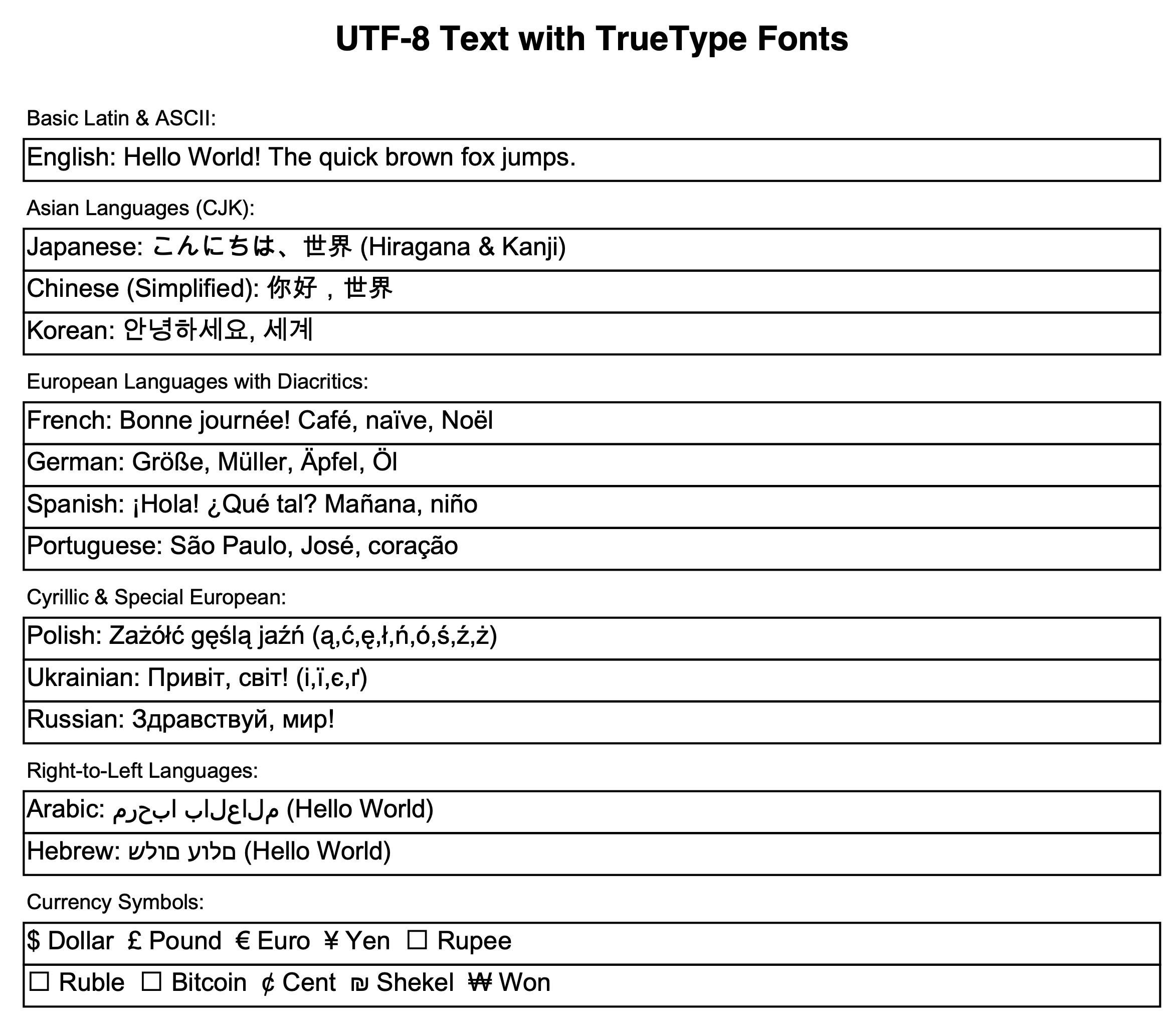 - ✅ UTF-8/Unicode - TrueType font support with full Unicode